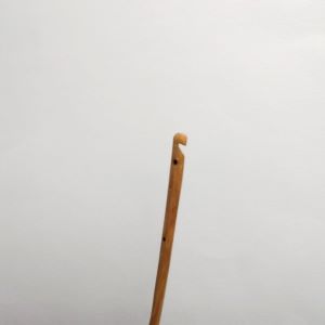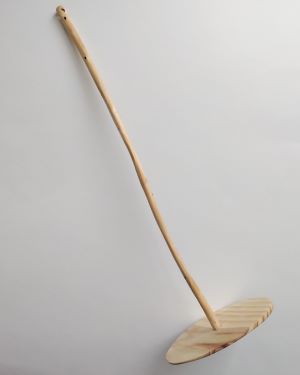 厚さは均一ではない1mm~4mm、直径7.5cmの底板。枝を中心に差す、約4mm、比較的まっすぐなものを選んだが、曲がり有。糸をひっかける機能として、フック状の切り込みを入れる。木の枝でかぎ針を作ってみるのにはまっている時期があったが、それが役に立った。
